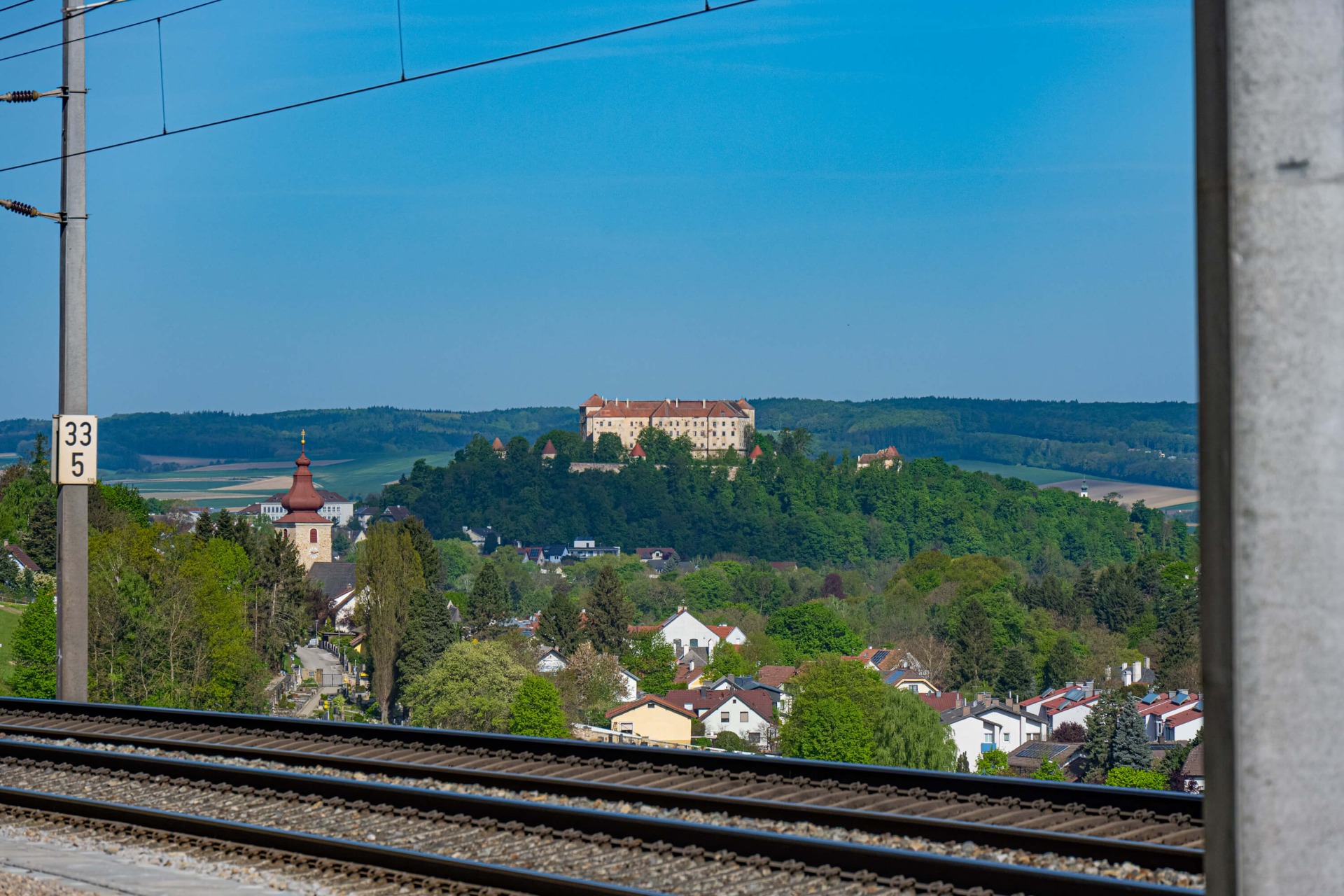 Anmerkung: Wir sind diesmal ganz bequem mit der S51 ab Wien angereist. Der Bahnhof ist rd. 500 m entfernt. Und die S-Bahn fährt alle 30 Minuten.