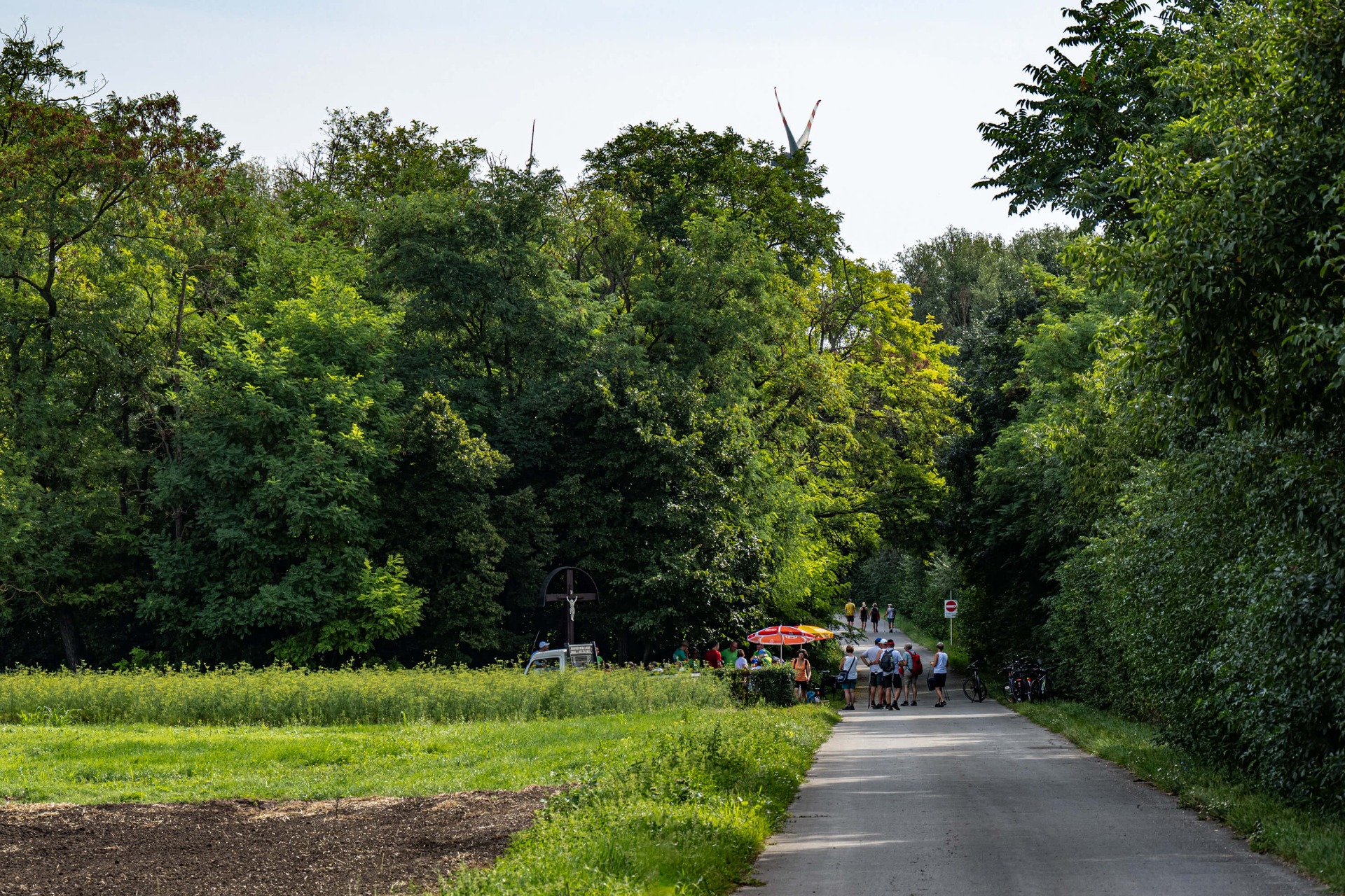 Der Weg ist erwartungsgemäß flach, wobei so bisserl Hügelchen gibt es hier auch. Und Windräder in großer Menge. Noch stehen sie fast alles still. Ich möchte hier keine Diskussion über diese neuen Landmarken losbrechen, finde sie sind schon faszinierende Riesen auf der pannonischen Tiefebene.